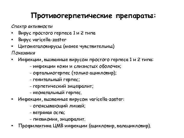 Противогерпетические препараты: Спектр активности • Вирус простого герпеса 1 и 2 типа • Вирус varicella-zoster • Цитомегаловирусы (менее чувствительны) Показания • Инфекции, вызванные вирусом простого герпеса 1 и 2 типа: - инфекции кожи и слизистых оболочек; - офтальмогерпес (только ацикловир); - генитальный герпес; - герпетический энцефалит; - неонатальный герпес. • Инфекции, вызванные вирусом varicella-zoster: - опоясывающий лишай; - ветряная оспа; - пневмония, энцефалит. • Профилактика ЦМВ инфекции (ацикловир, валацикловир).