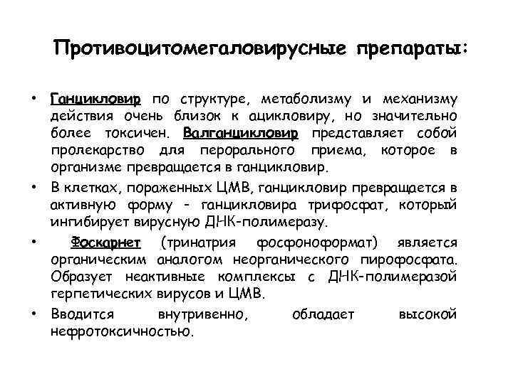 Противоцитомегаловирусные препараты: • Ганцикловир по структуре, метаболизму и механизму действия очень близок к ацикловиру, но значительно более токсичен. Валганцикловир представляет собой пролекарство для перорального приема, которое в организме превращается в ганцикловир. • В клетках, пораженных ЦМВ, ганцикловир превращается в активную форму - ганцикловира трифосфат, который ингибирует вирусную ДНК-полимеразу. • Фоскарнет (тринатрия фосфоноформат) является органическим аналогом неорганического пирофосфата. Образует неактивные комплексы с ДНК-полимеразой герпетических вирусов и ЦМВ. • Вводится внутривенно, обладает высокой нефротоксичностью.