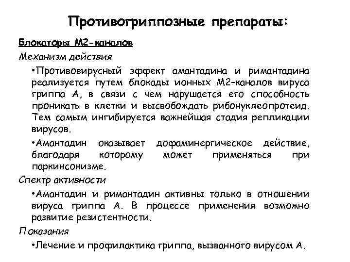 Противогриппозные препараты: Блокаторы М 2 -каналов Механизм действия • Противовирусный эффект амантадина и римантадина реализуется путем блокады ионных М 2–каналов вируса гриппа А, в связи с чем нарушается его способность проникать в клетки и высвобождать рибонуклеопротеид. Тем самым ингибируется важнейшая стадия репликации вирусов. • Амантадин оказывает дофаминергическое действие, благодаря которому может применяться при паркинсонизме. Спектр активности • Амантадин и римантадин активны только в отношении вируса гриппа А. В процессе применения возможно развитие резистентности. Показания • Лечение и профилактика гриппа, вызванного вирусом А.