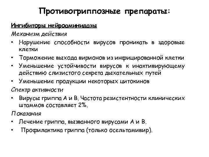 Противогриппозные препараты: Ингибиторы нейроаминидазы Механизм действия • Нарушение способности вирусов проникать в здоровые клетки • Торможение выхода вирионов из инфицированной клетки • Уменьшение устойчивости вирусов к инактивирующему действию слизистого секрета дыхательных путей • Уменьшение продукции некоторых цитокинов Спектр активности • Вирусы гриппа А и В. Частота резистентности клинических штаммов составляет 2%. Показания • Лечение гриппа, вызванного вирусами А и В. • Профилактика гриппа (только осельтамивир).
