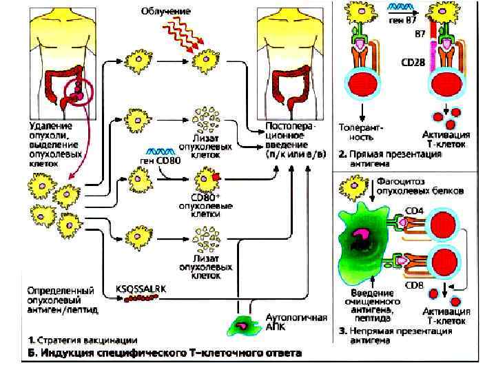 Индукция специфического Тклеточного ответа • Даже в идеальной ситуации, когда опухолевые клетки осуществляют презентацию опухолевого антигена Тклеткам, сильный иммунный ответ не достигается из-за отсутствия у опухолевых клеток ко-стимуляторных молекул типа В 7 (СD 80/СD 86). • Проведен целый ряд испытаний генетически модифицированных опухолевых клеток, экспрессировавших В 7 для усиления иммуногенности.