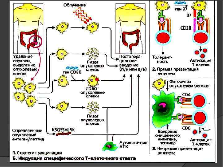 Активная специфическая терапия Вакцины из инактивированных или модифицированных опухолевых клеток, опухолевые клеточные экстракты, очищенные или рекомбинантные опухолевые антигены, идиотипы, вирусные или бактериальные гены-векторы, внедряемые в опухоль. Вакцинация против онкогенных вирусов - гепатита В, вирусов папиломмы, Т-клеточного лейкоза человека (HTLV-1), вируса Эпштейн-Барра.