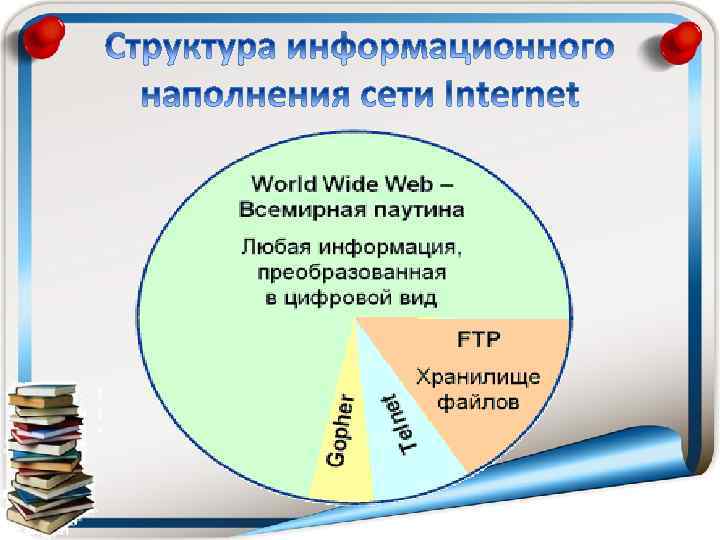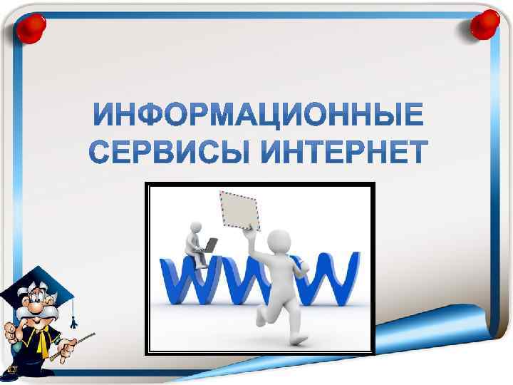 World Wide Web – глобальная система распространения информации, в которой для поиска и просмотра информации используются гипертекстовые связи. E-mail – электронная почта (off-line). Разговор в сети IRC (Internet Relay Chat) – общение между находящимися на линии путём ввода текста с клавиатуры (online). Usenet, News – телеконференции, группы новостей – разновидность сетевой газеты или доски объявлений. (on-line). FTP – служба передачи файлов. Telnet – служба удаленного доступа к компьютерам. Gopher – служба доступа к информации с помощью иерархических каталогов.