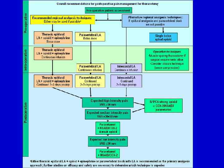 Примечания 8 Ингибиторы ЦОГ-2: мелоксикам, нимесулид 9 Доза парацетамола не более 4 грамм в сутки. В раннем послеоперационном периоде предпочтительней использовать внутривенную форму. Длительность применения внутривенной формы – до 72 часов. При восстановлении способности принимать пищу – переход на пероральные формы. Из пероральных форм предпочтение отдать быстрорастворимым в воде. Длительность приема – до 5 суток. 10 Для ЭА после операции использовать низкие концентрации МА длительного действия (0, 2% раствор ропивакаина, 0, 2% раствор бупивакаина) в комбинации с опиоидами (фентанил, морфин). Целесообразно применять методику постоянной инфузии или аутоанальгезии. Болюсное введение - при отсутствии шприцевых дозаторов. В связи с развитием тахифилаксии использование лидокаина для послеоперационной эпидуральной анальгезии не рекомендуется.