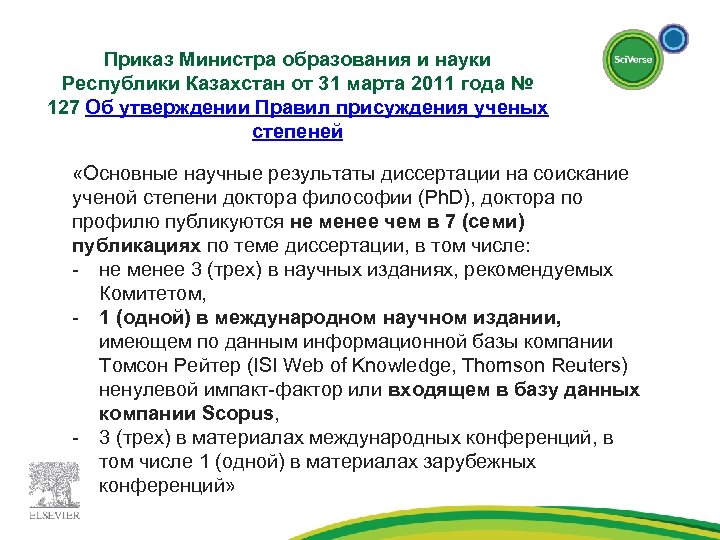 Приказ Министра образования и науки Республики Казахстан от 31 марта 2011 года № 127 Об утверждении Правил присуждения ученых степеней «Основные научные результаты диссертации на соискание ученой степени доктора философии (Ph. D), доктора по профилю публикуются не менее чем в 7 (семи) публикациях по теме диссертации, в том числе: - не менее 3 (трех) в научных изданиях, рекомендуемых Комитетом, - 1 (одной) в международном научном издании, имеющем по данным информационной базы компании Томсон Рейтер (ISI Web of Knowledge, Thomson Reuters) ненулевой импакт-фактор или входящем в базу данных компании Scopus, - 3 (трех) в материалах международных конференций, в том числе 1 (одной) в материалах зарубежных конференций»