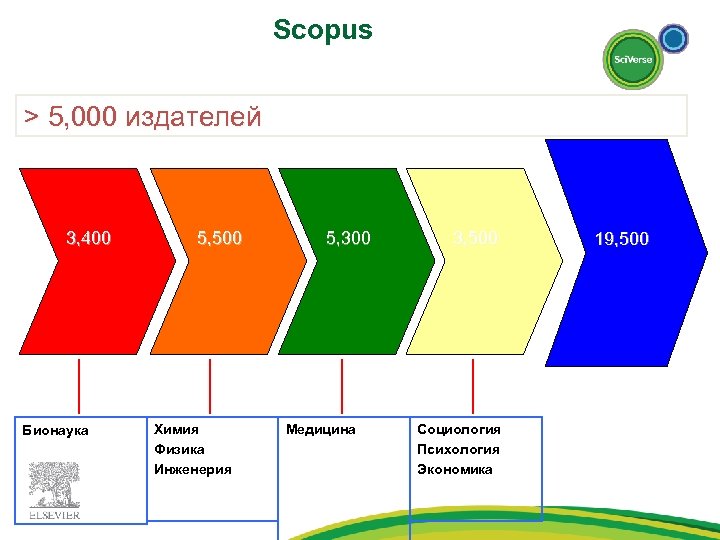 Scopus > 5, 000 издателей 3, 400 Бионаука 5, 500 Химия Физика Инженерия 5, 300 Медицина 3, 500 Социология Психология Экономика 19, 500