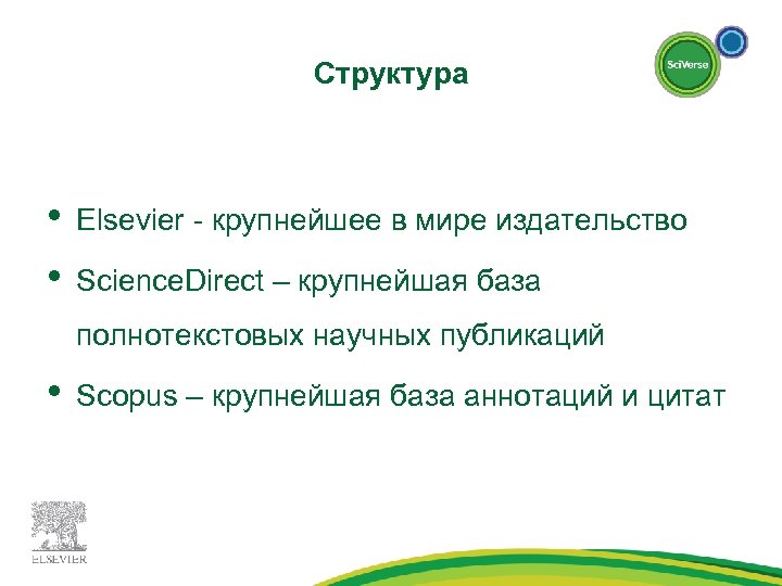 Структура • • Elsevier - крупнейшее в мире издательство Science. Direct – крупнейшая база полнотекстовых научных публикаций • Scopus – крупнейшая база аннотаций и цитат