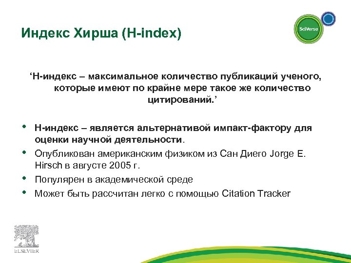Индекс Хирша (H-index) ‘H-индекс – максимальное количество публикаций ученого, которые имеют по крайне мере такое же количество цитирований. ’ • • H-индекс – является альтернативой импакт-фактору для оценки научной деятельности. Опубликован американским физиком из Сан Диего Jorge E. Hirsch в августе 2005 г. Популярен в академической среде Может быть рассчитан легко с помощью Citation Tracker