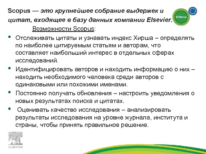 Scopus — это крупнейшее собрание выдержек и цитат, входящее в базу данных компании Elsevier. Возможности Scopus: • Отслеживать цитаты и узнавать индекс Хирша – определять по наиболее цитируемым статьям и авторам, что составляет наибольший интерес в отдельных сферах исследований. • Идентифицировать авторов и находить информацию о них – находить необходимого человека среди авторов с одинаковыми или похожими именами. • Постоянно получать обновления – настроить уведомления о новых результатах поиска и цитатах. • Оценивать качество исследования – анализировать результаты исследования на уровне журнала, института и страны, чтобы принять правильное решение.