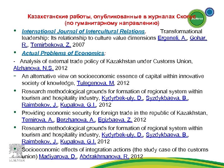 Казахстанские работы, опубликованные в журналах Скопус (по гуманитарному направлению) • International Journal of Intercultural Relations. Transformational leadership: Its relationship to culture value dimensions Ergeneli, A. , Gohar, R. , Temirbekova, Z. 2007 • Actual Problems of Economics: - Analysis of external trade policy of Kazakhstan under Customs Union, Alzhanova, N. S. 2012 - An alternative view on socioeconomic essence of capital within innovative society of knowledge, Tulegenova, M, 2012 • Research methodological grounds formation of regional system within tourism and hospitality industry, Kydyrbek-uly, D. , Syzdykbaeva, B. , Raimbekov, J. , Kupalova, G. I. , 2012 • Providing economic security foreign trade in the republic of Kazakhstan, Temirova, A. , Berzhanova, A. , Egizbaeva, Z. 2012 • Research methodological grounds formation of regional system within tourism and hospitality industry, Kydyrbek-uly, D. , Syzdykbaeva, B. , Raimbekov, J. , Kupalova, G. I. 2012 • Socioeconomic effects of integration actions (the study case of the customs union) Madiyarova, D. , Abdrakhmanova, R. 2012
