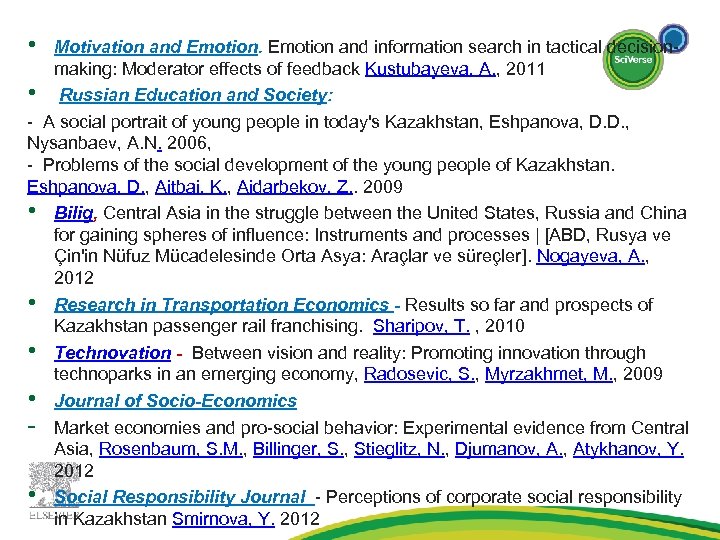 • Motivation and Emotion and information search in tactical decisionmaking: Moderator effects of feedback Kustubayeva, A. , 2011 • Russian Education and Society: - A social portrait of young people in today's Kazakhstan, Eshpanova, D. D. , Nysanbaev, A. N. 2006, - Problems of the social development of the young people of Kazakhstan. Eshpanova, D. , Aitbai, K. , Aidarbekov, Z. . 2009 • Bilig, Central Asia in the struggle between the United States, Russia and China for gaining spheres of influence: Instruments and processes | [ABD, Rusya ve Çin'in Nüfuz Mücadelesinde Orta Asya: Araçlar ve süreçler]. Nogayeva, A. , 2012 • Research in Transportation Economics - Results so far and prospects of Kazakhstan passenger rail franchising. Sharipov, T. , 2010 • Technovation - Between vision and reality: Promoting innovation through technoparks in an emerging economy, Radosevic, S. , Myrzakhmet, M. , 2009 • Journal of Socio-Economics - Market economies and pro-social behavior: Experimental evidence from Central Asia, Rosenbaum, S. M. , Billinger, S. , Stieglitz, N. , Djumanov, A. , Atykhanov, Y. 2012 • Social Responsibility Journal - Perceptions of corporate social responsibility in Kazakhstan Smirnova, Y. 2012