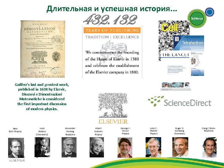 Длительная и успешная история. . . 432. 132 Galileo’s last and greatest work, published in 1638 by Elzevir, Discorsi e Dimostrazioni Matematiche is considered the first important discussion of modern physics. Niels Bohr Physics Louis Pasteur (Chemistry) 4 Alexander Fleming Medicine Albert Einstein Physics George F. Smoot Physics John C. Mather Physics Roger D. Kornberg Chemistry Craig C Mello Medicine