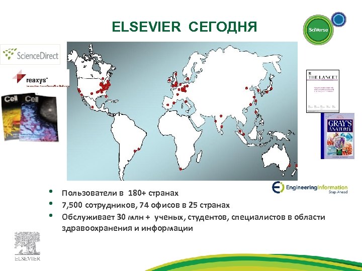 ELSEVIER СЕГОДНЯ • • • Пользователи в 180+ странах 7, 500 сотрудников, 74 офисов в 25 странах Обслуживает 30 млн + ученых, студентов, специалистов в области здравоохранения и информации