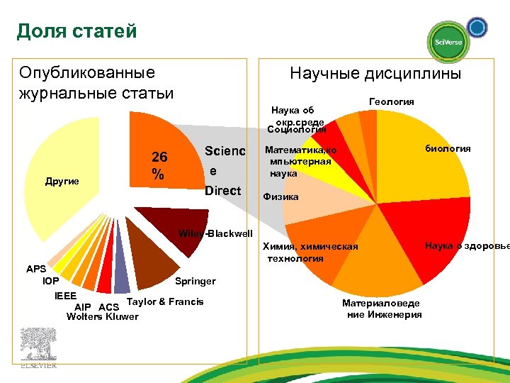 Доля статей Опубликованные журнальные статьи Научные дисциплины Геология Наука об окр. среде Социология 26% Другие Others Scienc 26 % e Direct биология Математика, ко мпьютерная наука Физика Wiley-Blackwell APS IOP Химия, химическая технология Springer IEEE Taylor & Francis AIP ACS Wolters Kluwer Материаловеде ние Инженерия Наука о здоровье