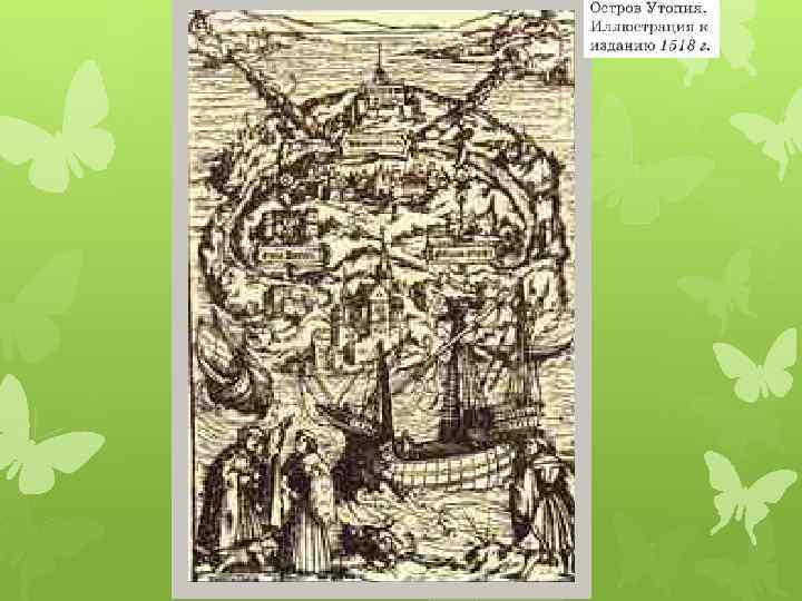 Томас Мор (1478 – 1535) В своем произведении «Утопия» , он описал о событиях в Англии, поведал о прекрасном острове, где не существовало частной собственности. В идеальном обществе Мора царила религиозная терпимость.