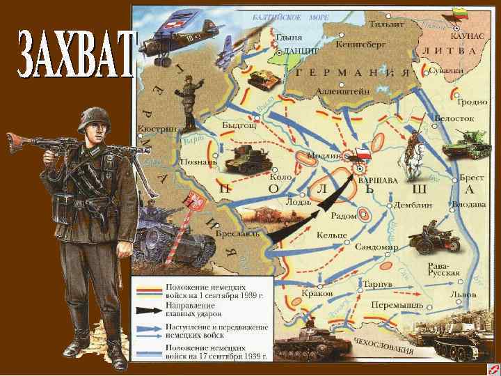 Начало войны. Военные действия Германии против Польши. n n n 1 сентября 1939 г. — нападение Германии на Польшу. Начало Второй мировой войны 3 сентября 1939 г. — Великобритания и Франция объявляют войну Германии 17 сентября 1939 г. — вступление Красной Армии на территорию Польши 28 сентября 1939 г. — советско-германский договор «О дружбе и границе» 30 ноября 1939 г. — 12 марта 1940 г. — советскофинляндский конфликт — «Зимняя война»