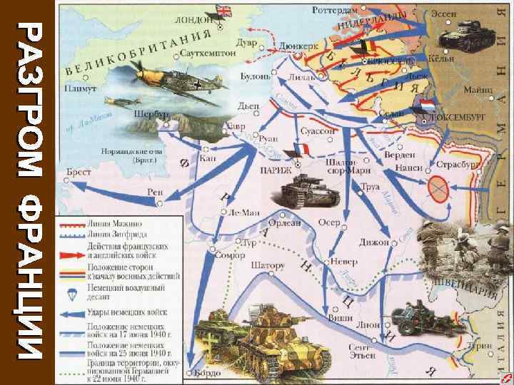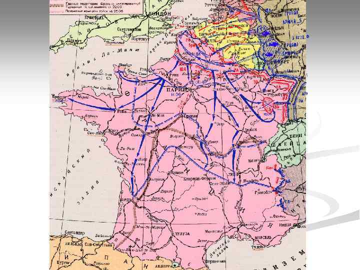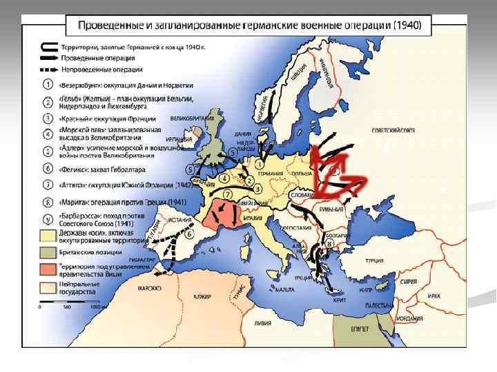 «Странная война» . Разгром Франции. n n n n 9 апреля 1940 г. — нападение Германии на Данию и Норвегию 10 мая 1940 г. — нападение Германии на Бельгию, Нидерланды, Люксембург 10 июня 1940 г. — Италия объявляет войну Великобритании и Франции. Появление африканского театра военных действий 22 июня 1940 г. — капитуляция Франции 8 августа 1940 г. — начало немецких налетов на Англию октябрь 1940 г. — нападение Италии на Грецию 6 апреля 1941 г. — нападение Германии на Югославию и Грецию