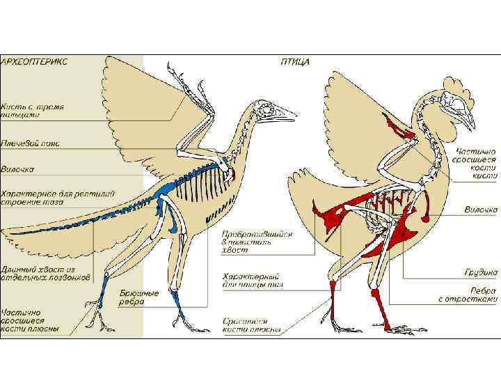 4. Скелет легкий, кости полые, большинство костей срослось. На ногах есть цевка, на грудине есть киль (у большинства). Позвоночник из 5 отделов: шейный, грудной, поясничный, крестцовый, хвостовой.