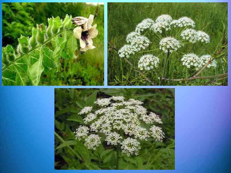 Отравления ядовитыми растениями Название Белена черная Вех ядовитый Клинические проявления Части ядовитых растений, ошибочно принимаемые за съедобные Симптомы отравления наступают через 15 - 60. Спутанность сознания, возбуждение, галлюцинации Корень принимается за петрушку, турнепс. Молодые его листья принимают за щавель, лебеду. Начинается через 1 -2 ч. Рвота, синюшность слизистых, общее тяжелое состояние, ступор, расширение зрачков и потеря сознания Корнивицу принимают за свеклу, турнепс, “дикую морковь”, т. к. имеет сладковатый вкус и запах сушеных яблок Судороги, нарушение Болиголов чувствительности, смерть пятнистый от асфиксии, параличи мелких групп мышц Листья и корни принимают за петрушку