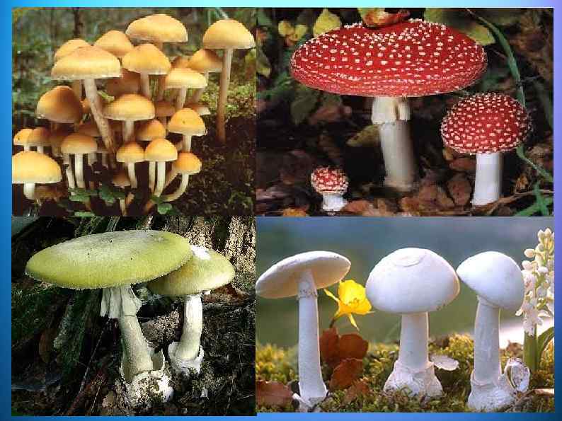 Пищевые отравления ядовитыми грибами Название Сезон грибов Ядовитое начало Клинические проявления Строчки Гельвелловая к-та (гемолитическим, гепатотропным действием) Инкубационный период 8 -10 ч. Боли в животе, резь, неукротимая рвота. На второй день желтуха. Смертность 25% при сердечной слабости, в коматозном состоянии аманитогемолизин (инактивируется при 70 ) аманитотоксин (сильнейший яд) гепатотоксический (нейротоксический) Инкубационный период 9 -11 ч. Расстройство желудочнокишечного тракта, частый понос, неукротимая рвота, обезвоживание организма, увеличение печени, желтуха, коматозное состояние. Летальность более 50% Ранней весной Бледная июль- поганка сентябрь (белая, зеленова тая, оливково -зеленая)