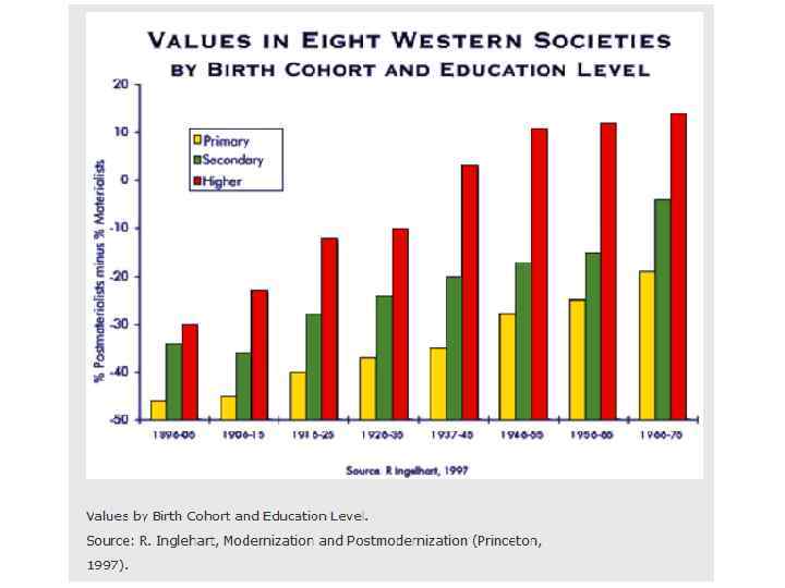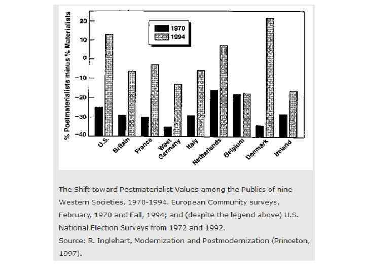 В праці “Тиха революція”, виданій у 1977 р. Інґлегарт виявив значний зсув у ціннісних орієнтаціях населення розвинених індустріальних суспільств.