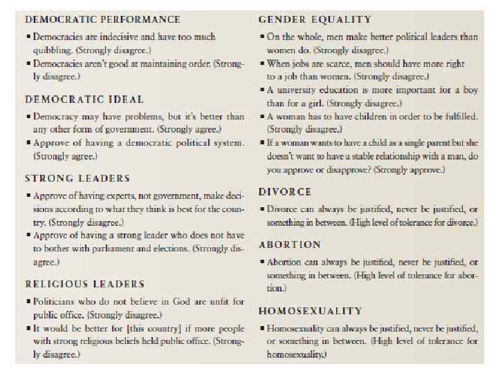 Розширений перелік питань: A. Підтримувати високі показники економічного росту; B. Дбати про високу боєздатність армії; C. Надавати більше можливостей громадян впливати на те, які рішення приймають їхні роботодавці і уряд; D. Намагатися, щоби наші міста і села ставали гарнішими і облаштованішими; E. Підтримувати стабільну ситуацію в економіці; F. Боротися зі злочинністю; G. Розвиватися у бік більш дружнього, менш знеосібленого суспільства; H. Розвиватися у бік суспільства у якому ідеї є важливішими за гроші.