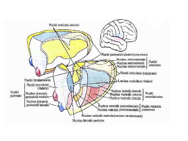 Таламус • • • Thalamus opticus Зрительный бугор Расположение – промежуточный мозг F: афферентная структура (все СС, кроме обонятельной) Возник у рептилий у млекопитающих – отд. ядра 6 ядерных групп • • ЯДРА ТАЛАМУСА • АНАТОМИЧЕСКИЕ ФИЗИОЛОГИЧЕСКИЕ