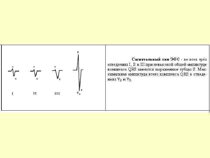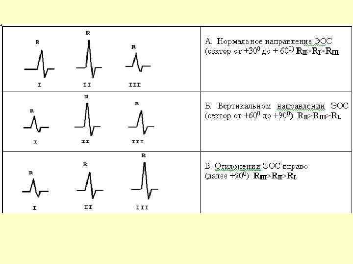 Блокада передней ветви левой ножки пучка Гиса. • Схема изменения движения волны возбуждения из задней ветви левой ножки пучка Гиса в проводящую систему заблокированной передней ветви левой ножки отклоняет ЭОС резко влево • - Отклонение электрической оси сердца влево (от – 30° до – 90°). Низкий зубец R и глубокий зубец S в отведениях II, III и a. VF. Высокий зубец R в отведениях I и a. VL. • - В отведении a. VR увеличенный зубец R (поздняя активация'). Характерно смещение переходной зоны влево в грудных отведениях