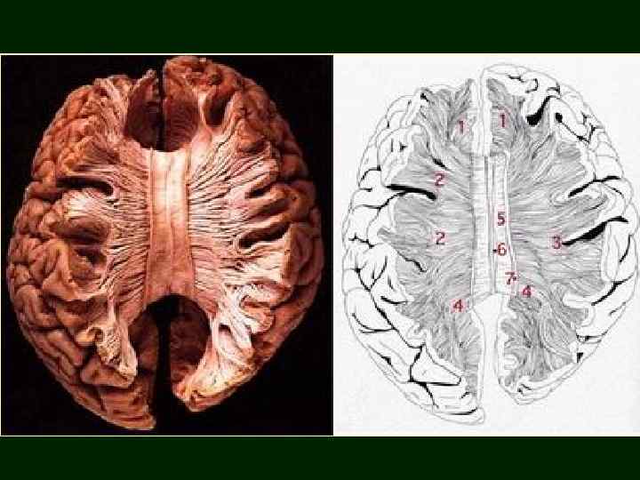 Типы нервных волокон • Ассоциативные (соединяют различные участки коры одного полушария) • Комиссуральные (соединяют симметричные участки серого вещества правого и левого полушарий) • Проекционные (соединяют вышележащие и нижележащие отделы мозга)
