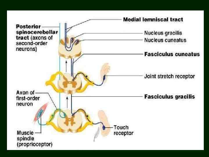 • 1 нейрон – спинальный ганглий • 2 нейрон – грудное ядро спинного мозга • 3 нейрон – ядра и кора мозжечка