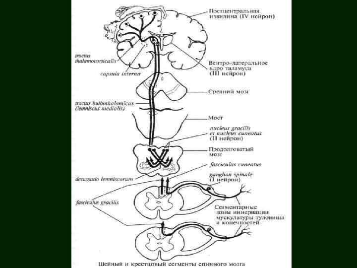 • 1 нейрон – спинальный ганглий • 2 нейрон – тонкое и клиновидное ядра продолговатого мозга • 3 нейрон – вентролатеральное ядро таламуса • 4 нейрон – кора постцентральной извилины