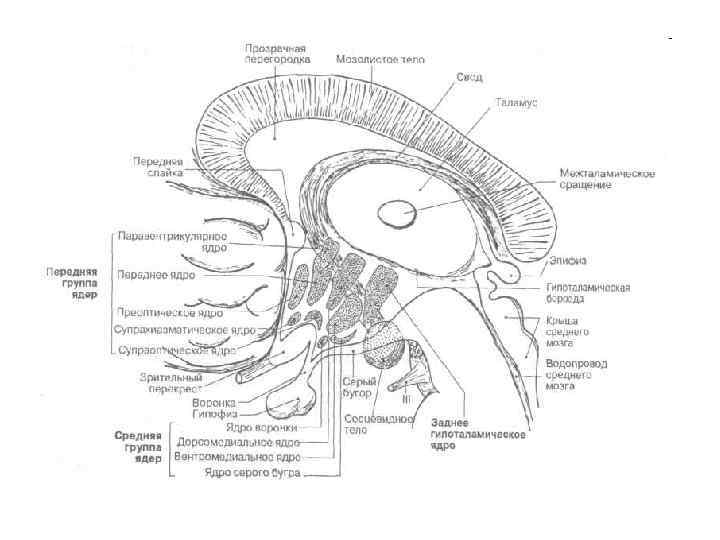Серое вещество гипоталамуса образует ядра, которые подразделяются на пять групп: Преоптическая группа медиальное и латеральное преоптические ядра перивентрикулярное ядро. супраоптическое, супрахиазматическое околожелудочковое ядра. Средняя группа 5 ядра серого бугра вентромедиальные и дорсомедиальные. Преоптическую Переднюю - заднюю Среднюю - наружную Передняя группа Задняя группа — Наружная группа латеральное гипоталамическое поле заднее гипоталамическое, латеральные и медиальные ядра сосцевидных тел