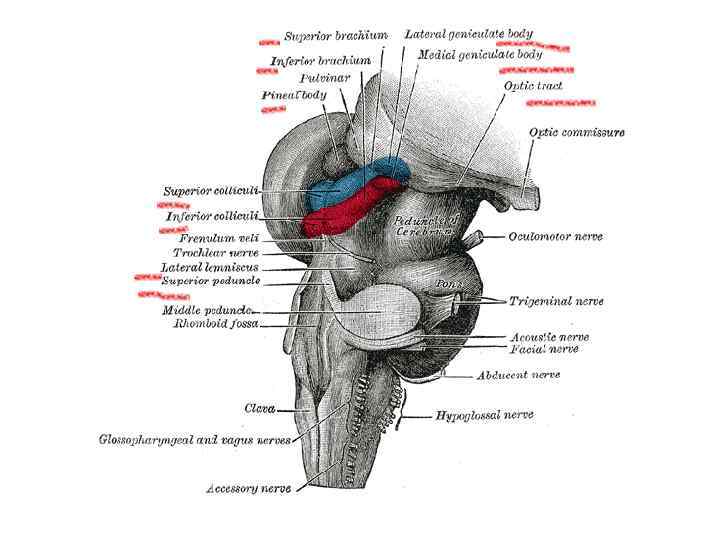 Таламус дорсальная поверхность 1. зрительный бугор 2. передний бугорок 3. подушка Ассоциативные ядра латеральное и вентральное ядро 6. концевая полоска 7. хвостатые ядра полушарий 8. мозговая полоска 9. шишковидное тело 10. треугольник поводка 11. поводок 12. III желудочек 13. спайка поводков 14. бугорки четверохолмия Метаталамус 4. медиальное коленчатое тело 5. латеральное коленчатое тело