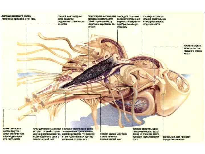 Ствол мозга (сагиттальный разрез) 3 гипоталамическая борозда 5 конечная пластинка 7. передняя спайка 8. сосцевидные тела 9. воронка 10. нейрогипофиз 11. аденогипофиз 12. перекрест зрительных нервов 13. предзрительное поле 14. шишковидное железа