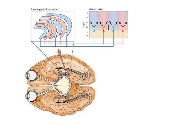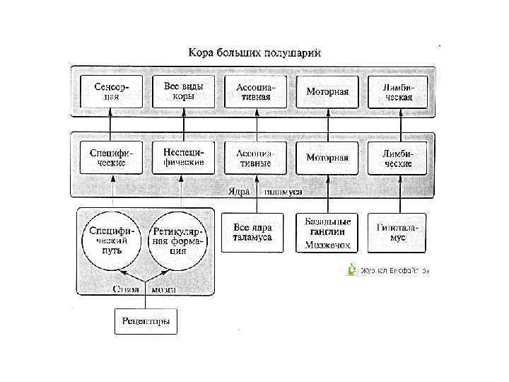 Переключательные ядра зрительной и слуховой сенсорных систем — ядра латерального и медиального коленчатых тел, а соматосенсорной системы — заднее вентральное ядро таламуса. Ассоциативными ядрами являются латеральные и медиальные ядра подушки. Таламус участвует в переработке сенсорных стимулов и регулирует цикл сон – бодрствование. • IV. Вентральные ядра таламуса: • 1 - дорсальное, участвует в передаче различных видов чувствительности через свод в гиппокамп и базальную кору височной доли, т. о. входит в состав лимбической системы. • 2 - переднее вентральное ядро, соединяется с бледными шарами, зубчатым ядром и имеет двухсторонние связи с корой предцентральной извилины. Поражается при болезни Паркинсона. • 3 - вентролатеральное, релейное. • 4 - заднелатеральное вентральное, на нейронах этого ядра заканчиваются волокна медиальной петли и спинно-таламического пути. Отсюда импульсы передаются в кору постцентральной извилины. • 5 - заднемедиальное вентральное, к нему подходят волокна тройничной петли. • 6 - медиальное центральное ядро. • 7 - заднелатеральное, связано с корой теменной доли. V. Задние ядра таламуса: 1 - ядро латерального коленчатого тела, нейроны этого ядра входят в состав зрительного пути. 2 - ядро медиального коленчатого тела, их нейроны входят в состав слухового тракта. 3 - ядра подушки, принимают полисенсорную информацию от других ядер таламуса и передает ее от: а) заднего ядра - на зрительную кору затылочной и задней теменной доли; в) среднего ядра - к передней теменной коре; с) переднего (орального) ядра - к слуховой коре височной доли