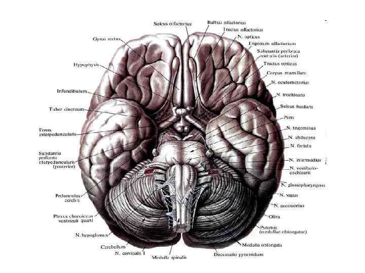 • 1 — ствол мозолистого тела; 2 — прозрачная перегородка; 3 — сосудистое сплетение III желудочка; 4 — таламус; 5 — межталамическое сращение; 6 — валик мозолистого тела; 7 — комиссура поводка; 8 — • шишковидная железа; 9 — задняя комиссура; 10 — вершина мозжечка; 11 — четверохолмие; 12 — скат; 13 • — червь мозжечка; 14 — листок червя; 15 — бугор червя; 16 — пирамида червя; 17 — язычок червя; 18 — • продолговатый мозг; 19 — нижний мозговой парус; 20 — узелок; 21 — Варолиев мост; 22 — полость IV • желудочка; 23 — центральная долька; 24 — верхний мозговой парус; 25 — язычок мозжечка; 26 — ножки • среднего мозга; 27 — мамиллярное тело; 28 — гипофиз; 29 — воронка; 30 — хиазма; 31 — углубление • воронки; 32 — гипоталамус; 33 — конечная пластинка; 34 — передняя комиссура; 35 — клюв мозолистого • тела; 36 — колено мозолистого тела