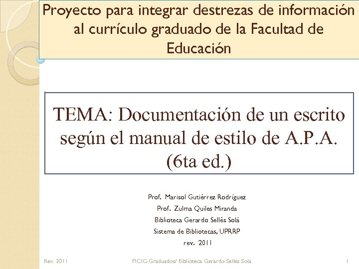 Proyecto para integrar destrezas de información al currículo graduado de la Facultad de Educación TEMA: Documentación de un escrito según el manual de estilo de A. P. A. (6 ta ed. ) Prof. Marisol Gutiérrez Rodríguez Prof. Zulma Quiles Miranda Biblioteca Gerardo Sellés Solá Sistema de Bibliotecas, UPRRP rev. 2011 Rev. 2011 PICIC-Graduados/ Biblioteca Gerardo Sellés Solá 1