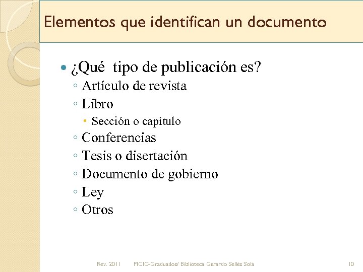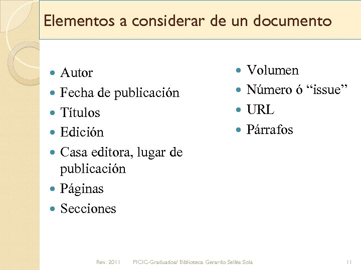 Elementos que identifican un documento ¿Qué tipo de publicación es? ◦ Artículo de revista ◦ Libro Sección o capítulo ◦ Conferencias ◦ Tesis o disertación ◦ Documento de gobierno ◦ Ley ◦ Otros Rev. 2011 PICIC-Graduados/ Biblioteca Gerardo Sellés Solá 10