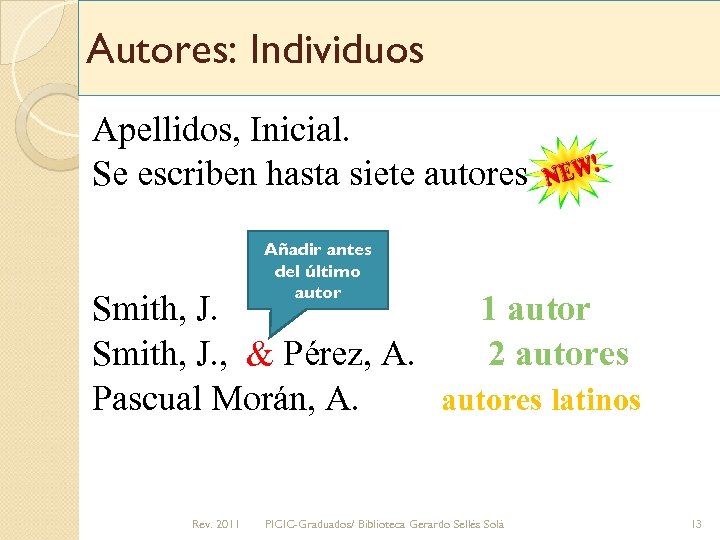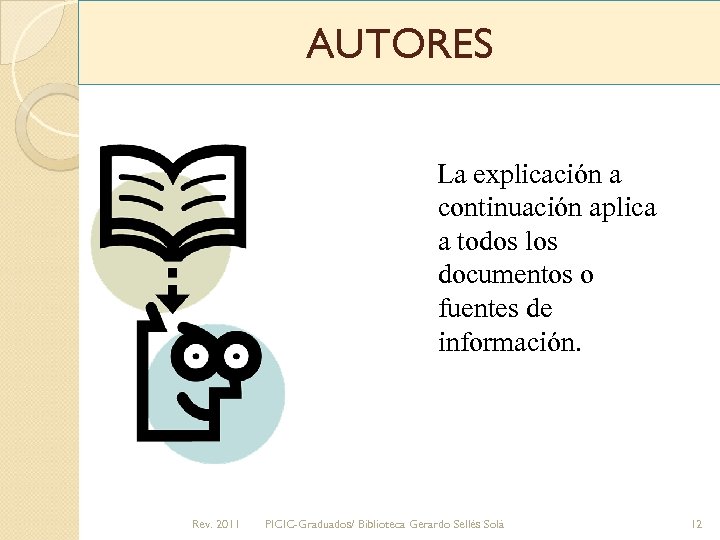 AUTORES La explicación a continuación aplica a todos los documentos o fuentes de información. Rev. 2011 PICIC-Graduados/ Biblioteca Gerardo Sellés Solá 12