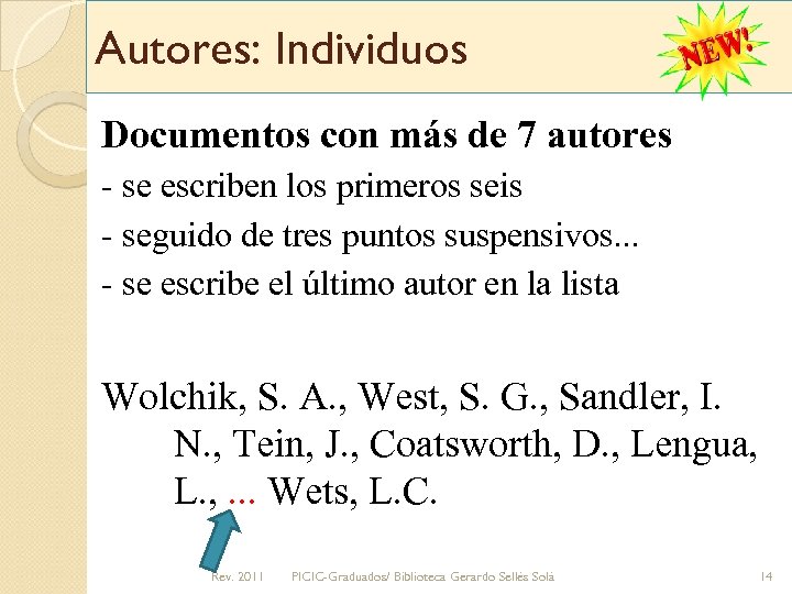 Autores: Individuos Apellidos, Inicial. Se escriben hasta siete autores Añadir antes del último autor Smith, J. 1 autor Smith, J. , & Pérez, A. 2 autores Pascual Morán, A. autores latinos Rev. 2011 PICIC-Graduados/ Biblioteca Gerardo Sellés Solá 13