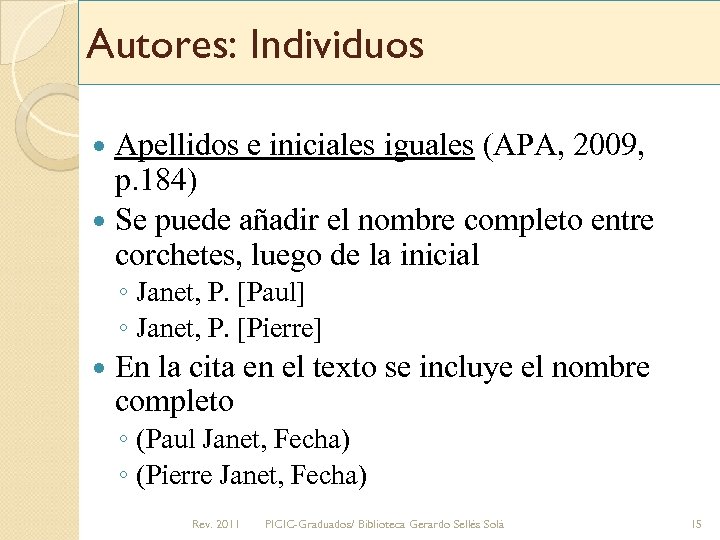 Autores: Individuos Apellidos e iniciales iguales (APA, 2009, p. 184) Se puede añadir el nombre completo entre corchetes, luego de la inicial ◦ Janet, P. [Paul] ◦ Janet, P. [Pierre] En la cita en el texto se incluye el nombre completo ◦ (Paul Janet, Fecha) ◦ (Pierre Janet, Fecha) Rev. 2011 PICIC-Graduados/ Biblioteca Gerardo Sellés Solá 15