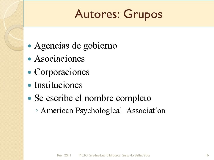 Autores: Grupos Agencias de gobierno Asociaciones Corporaciones Instituciones Se escribe el nombre completo ◦ American Psychological Association Rev. 2011 PICIC-Graduados/ Biblioteca Gerardo Sellés Solá 16
