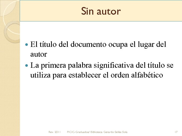 Sin autor El título del documento ocupa el lugar del autor La primera palabra significativa del título se utiliza para establecer el orden alfabético Rev. 2011 PICIC-Graduados/ Biblioteca Gerardo Sellés Solá 17