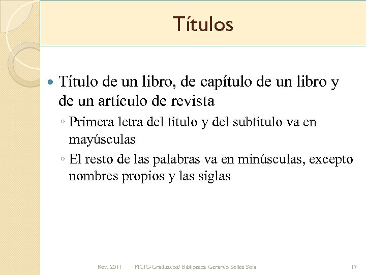 Títulos Título de la revista (publicaciones periódicas) ◦ No usar abreviaturas ◦ En letra itálica ◦ Mayúsculas y minúsculas Título de un libro ◦ En letra itálica Capítulo de un libro ó título de un del artículo ◦ Letra regular Rev. 2011 PICIC-Graduados/ Biblioteca Gerardo Sellés Solá 18