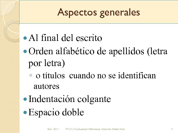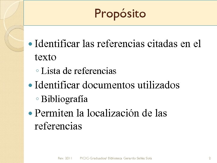 Propósito Identificar las referencias citadas en el texto ◦ Lista de referencias Identificar documentos utilizados ◦ Bibliografía Permiten la localización de las referencias Rev. 2011 PICIC-Graduados/ Biblioteca Gerardo Sellés Solá 2