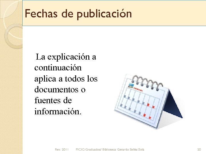 Fechas de publicación La explicación a continuación aplica a todos los documentos o fuentes de información. Rev. 2011 PICIC-Graduados/ Biblioteca Gerardo Sellés Solá 20