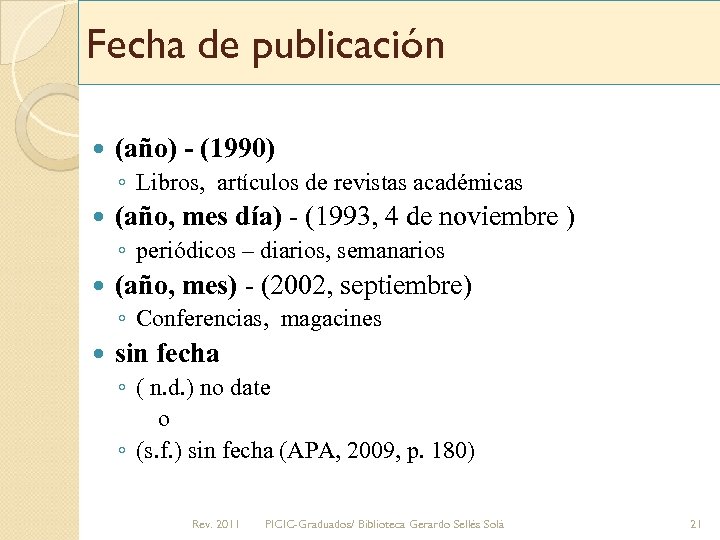 Fecha de publicación (año) - (1990) ◦ Libros, artículos de revistas académicas (año, mes día) - (1993, 4 de noviembre ) ◦ periódicos – diarios, semanarios (año, mes) - (2002, septiembre) ◦ Conferencias, magacines sin fecha ◦ ( n. d. ) no date o ◦ (s. f. ) sin fecha (APA, 2009, p. 180) Rev. 2011 PICIC-Graduados/ Biblioteca Gerardo Sellés Solá 21