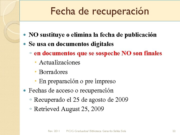 Fecha de recuperación NO sustituye o elimina la fecha de publicación Se usa en documentos digitales ◦ en documentos que se sospeche NO son finales Actualizaciones Borradores En preparación o pre impreso Fechas de acceso o recuperación ◦ Recuperado el 25 de agosto de 2009 ◦ Retrieved August 25, 2009 Rev. 2011 PICIC-Graduados/ Biblioteca Gerardo Sellés Solá 22