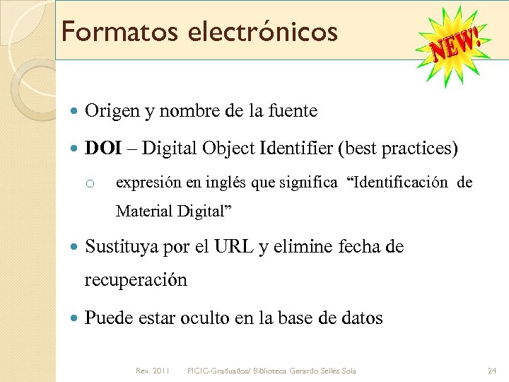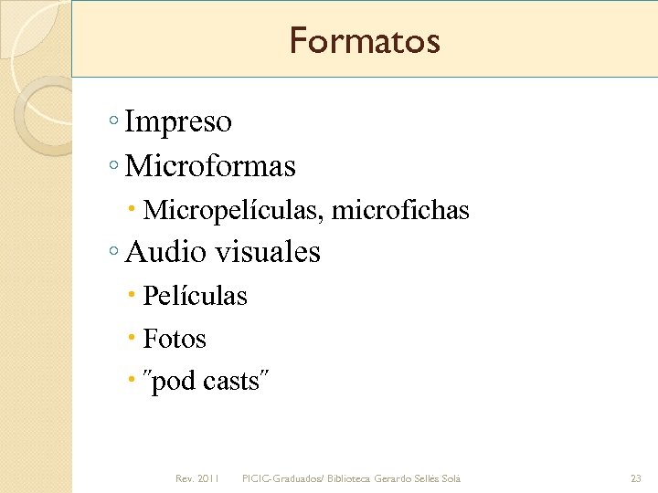 Formatos ◦ Impreso ◦ Microformas Micropelículas, microfichas ◦ Audio visuales Películas Fotos ˝pod casts˝ Rev. 2011 PICIC-Graduados/ Biblioteca Gerardo Sellés Solá 23