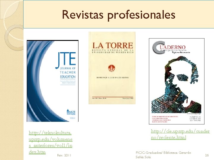 Revistas profesionales http: //teknokultura. uprrp. edu/volumene s_anteriores/vol 1/in dex. htm Rev. 2011 http: //cie. uprrp. edu/cuader no/reciente. html PICIC-Graduados/ Biblioteca Gerardo Sellés Solá 26